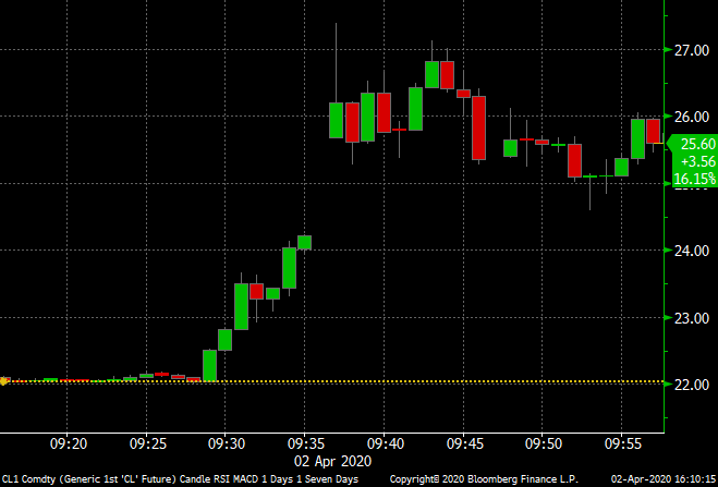 For example, today at 9:29 a.m. WTI crude oil futures went from $22.04/bbl to $27.39/bbl in eight minutes.