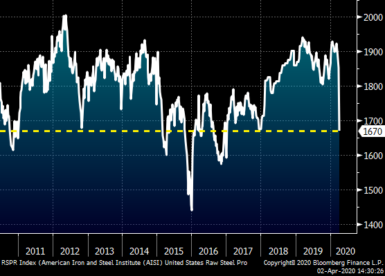 Mill production has moved abruptly lower with numerous mills shutting down blast furnaces and this week’s AISI utilization rate falling to 71.6 percent. Once the spread of the virus slows and the economy starts again, what will availability look like? Will demand come back faster than supply and will that cause a shortage that will rocket flat rolled prices higher?