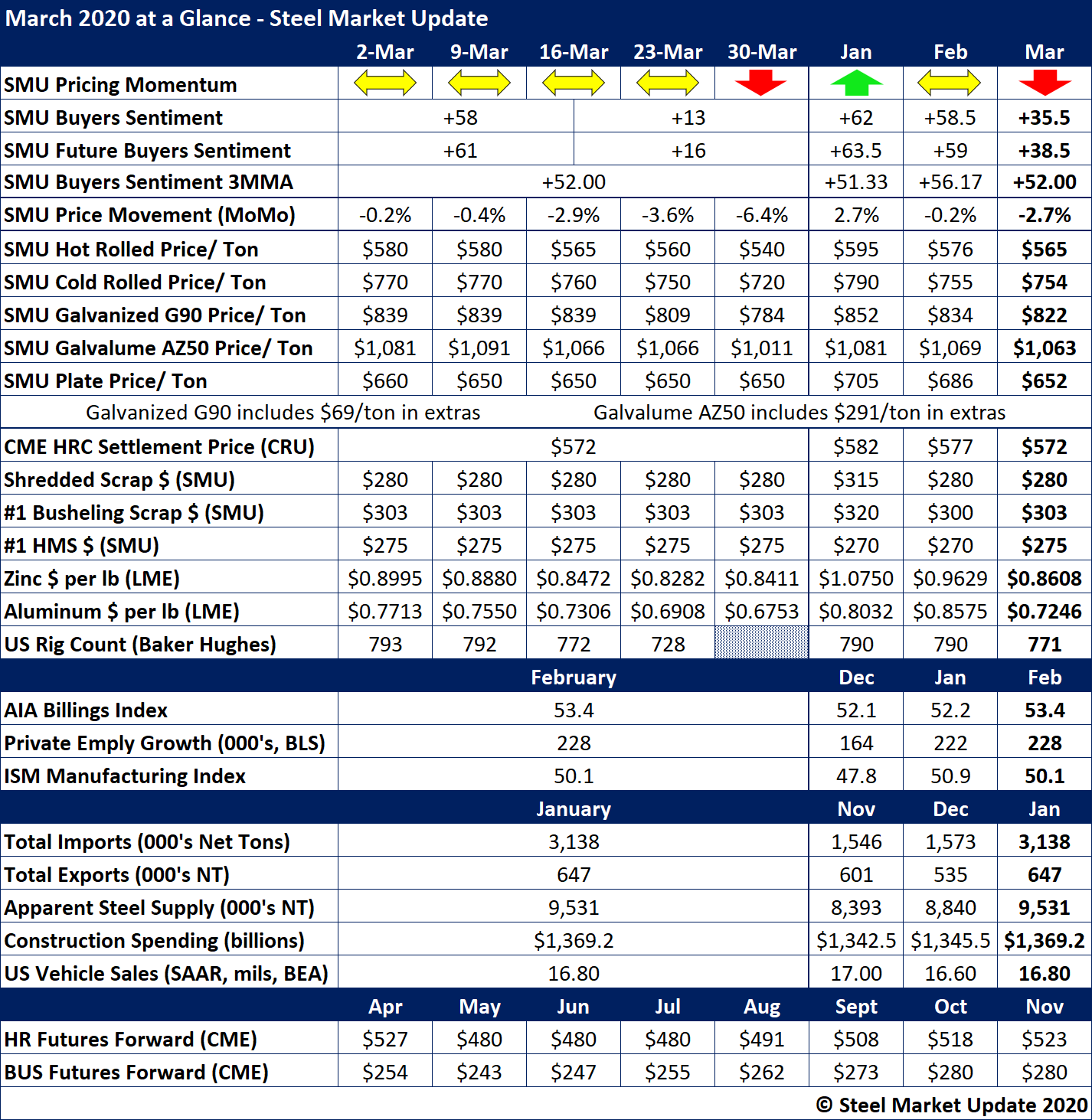 Flat rolled steel prices declined from February, with the benchmark price of hot rolled down to a monthly average of $565 per ton. SMU’s latest market canvass puts the average price of hot rolled at $540 per ton, down from a January high of $610 per ton. SMU’s Price Momentum Indicator was adjusted to Lower in the last week of March.