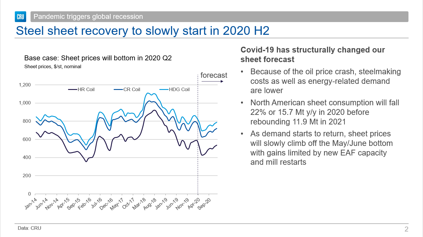 CRU’s current view is for North American steel sheet demand to rebound by 12 million metric tons in 2021.