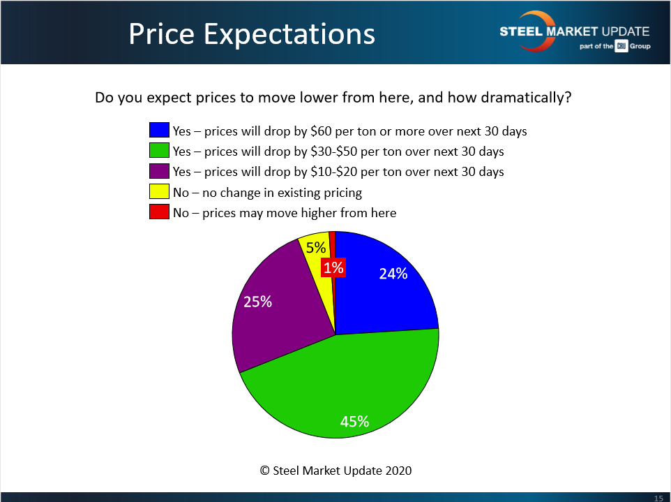 Steel buyers surveyed by Steel Market Update this week report that demand is plunging and they expect steel prices to continue declining right along with it for at least the next 30 days. The majority believe that efforts by the mills to cut production and match supply with demand will not be enough to establish a floor on steel prices.