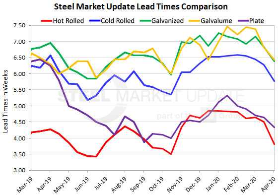 Lead times for spot orders of flat rolled and plate are shortening as steps to control the coronavirus decimate demand. Lead times for steel delivery are a measure of demand at the mill level—the shorter the lead time, the less busy the mill. Average lead times for most products have shortened by roughly half a week since mid-March, according to returns from Steel Market Update’s latest market trends questionnaire.