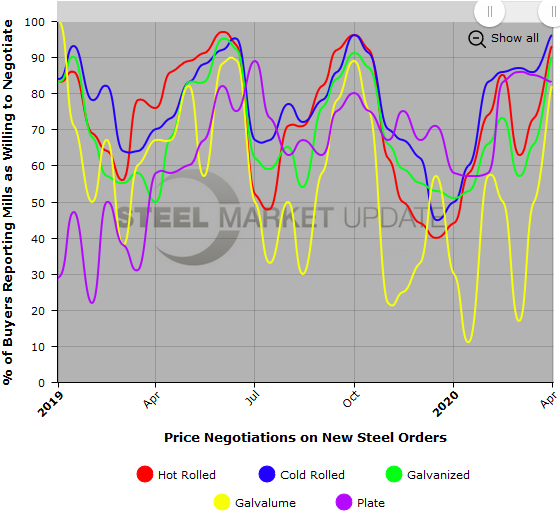 In the hot rolled segment, 93 percent of the steel buyers said the mills are willing to negotiate prices on HR, up 30 points from 63 percent in early March. In the cold rolled segment, 96 percent reported the mills willing to talk price, up from 87 percent a month ago. In galvanized, 90 percent reported the mills open to negotiation, up more than 30 points from the 57 percent four weeks ago. Similarly, 82 percent said they have found mills willing to compromise on Galvalume prices.