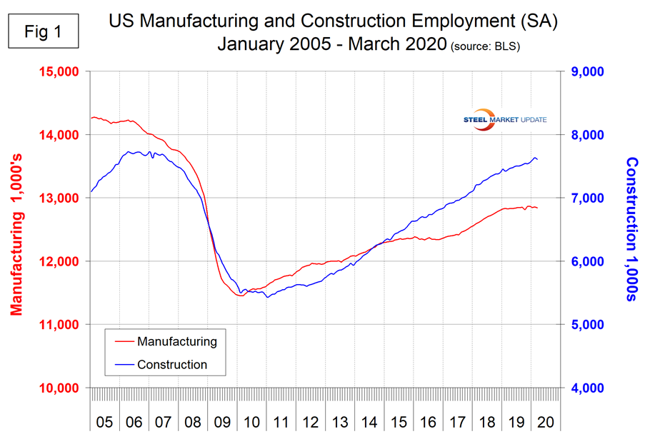 March data only accounts for the first half of the month and through that period the effect of the pandemic on manufacturing and construction employment was minimal (Figure 1).