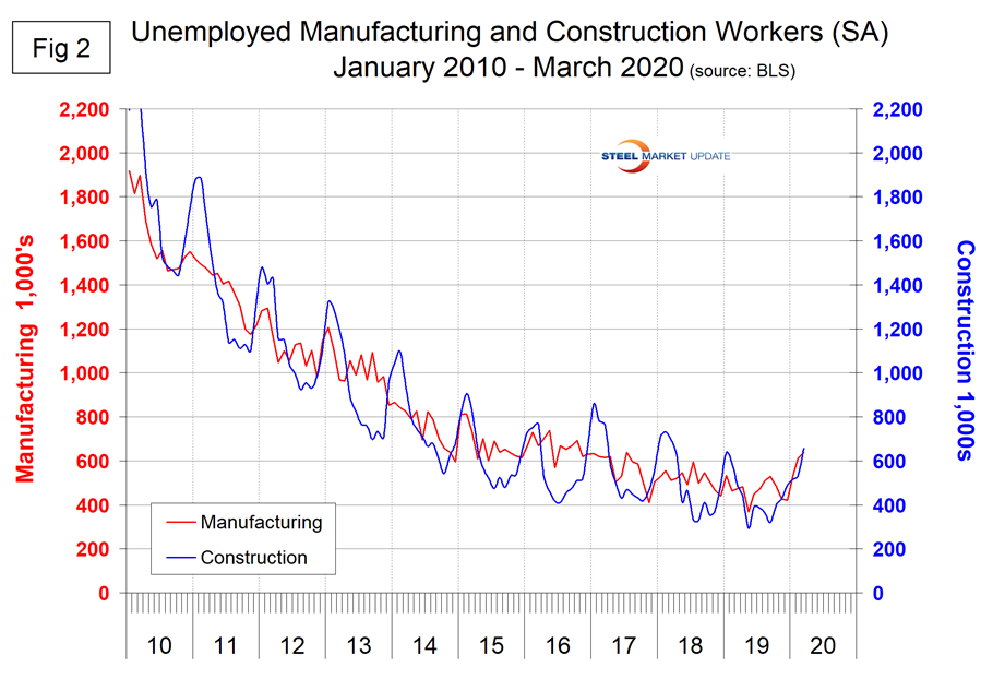 This month we have created new charts showing unemployment in manufacturing and construction industries. These are shown in Figure 2 and through the latest data didn’t show the magnitude of the situation. This will change in our April report. In March, service industries such as retail saw the biggest job declines. Service industries lost 647,000 jobs as goods-producing (mainly construction and manufacturing) lost 54,000 positions.