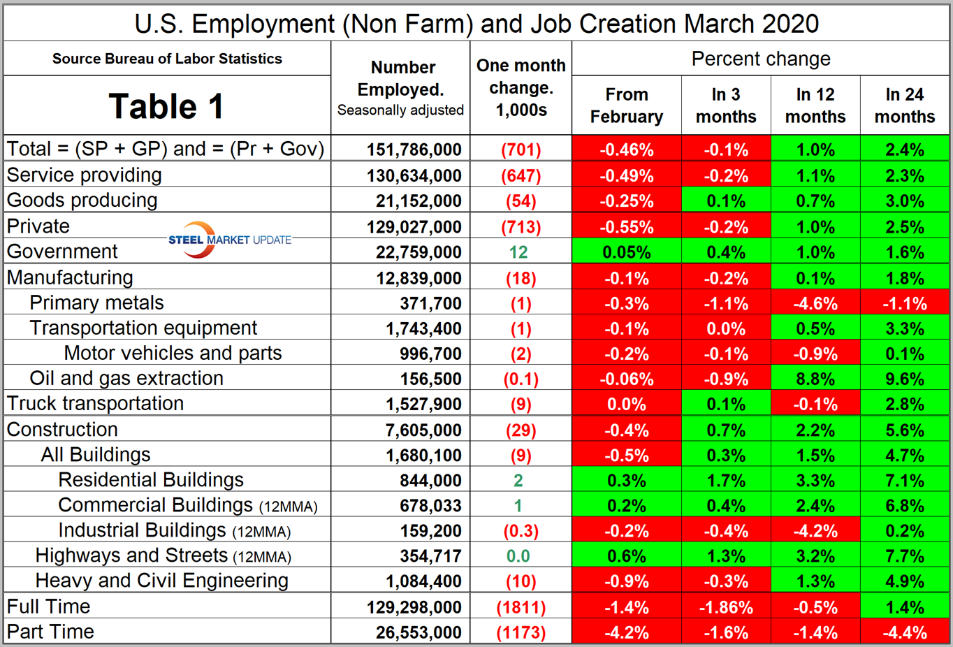 Table 1 breaks total employment down into service and goods-producing industries and then into private and government employees, based on data from an interim report from the Bureau of Labor Statistic for the first half of March. Most of the goods-producing employees work in manufacturing and construction; the components of these two sectors of most relevance to steel people are broken out in Table 1. Note, the subcomponents of both manufacturing and construction shown in Table 1 don’t add up to the total because we have only included those with the most relevance to the steel industry.
