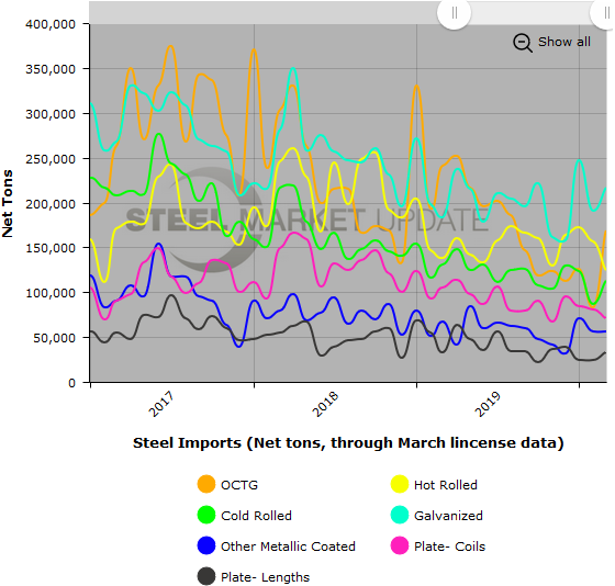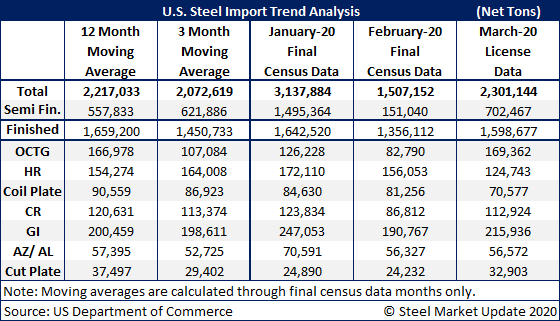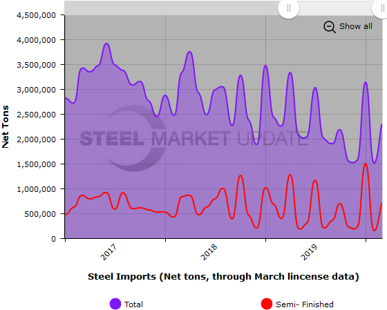 The two graphics below show total steel imports through March license data. To provide the most clarity, we are only showing a three-year snapshot. To see a greater data history and utilize our interactive graphing features, you can visit our website. Contact us at info@SteelMarketUpdate.com if you have any questions.