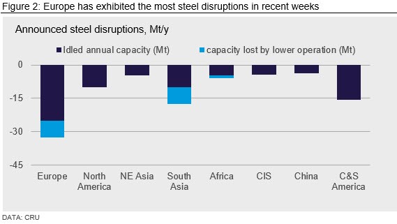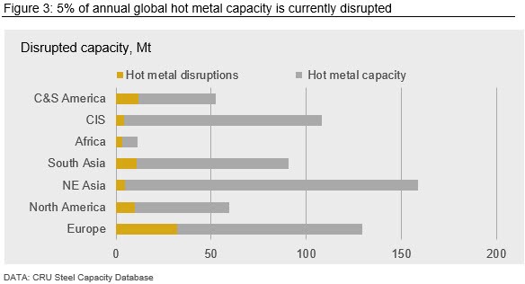 Among all regions, Europe accounts for the largest volume of disruptions. We estimate that 32 Mt of annual hot metal capacity are affected by the measures producers are taking in response to demand loss. In addition to this, we estimate that a further 22 Mt/y of steelmaking capacity is currently offline because all Italian EAF producers and non-operational after being ordered to close. In Italy, Ilva at Taranto and Arvedi in Cremona have both been exempted from the closure due to the nature of their operations. Other major European producers are running at lower levels.