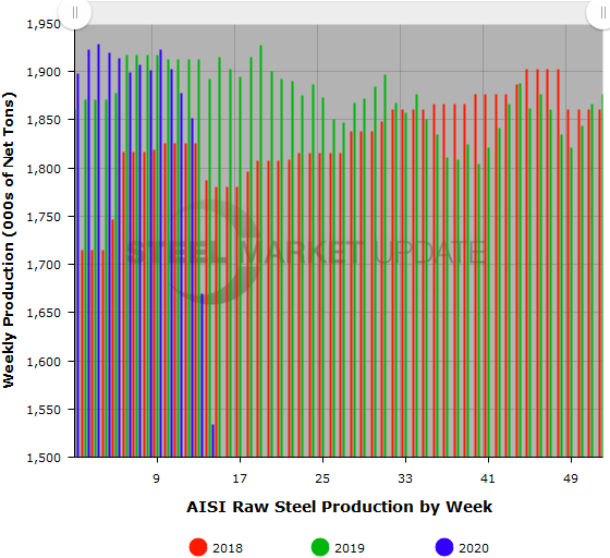 U.S. raw steel production plunged by another 8.1 percent in the week ending April 4, on top of a nearly 10 percent drop the prior week, as the coronavirus crisis eats into steel demand.