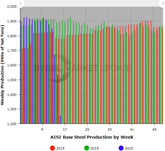 U.S. raw steel production continued to plummet last week as domestic steelmakers took further steps to adjust output to weak steel demand as the economy struggles with the coronavirus. Production in the April 11 week totaled 1,256,000 net tons with the mills operating at an average capability utilization rate of 56.1 percent, down from a rate of 68.5 percent in the week ending April 4, reported the American Iron and Steel Institute. The current week’s production represents a 33.6 percent decrease from the same week last year. The last time raw steel production was this low was the week ending July 25, 2009, during the Great Recession, when 1,254,000 tons were produced at a utilization rate of 52.6 percent.