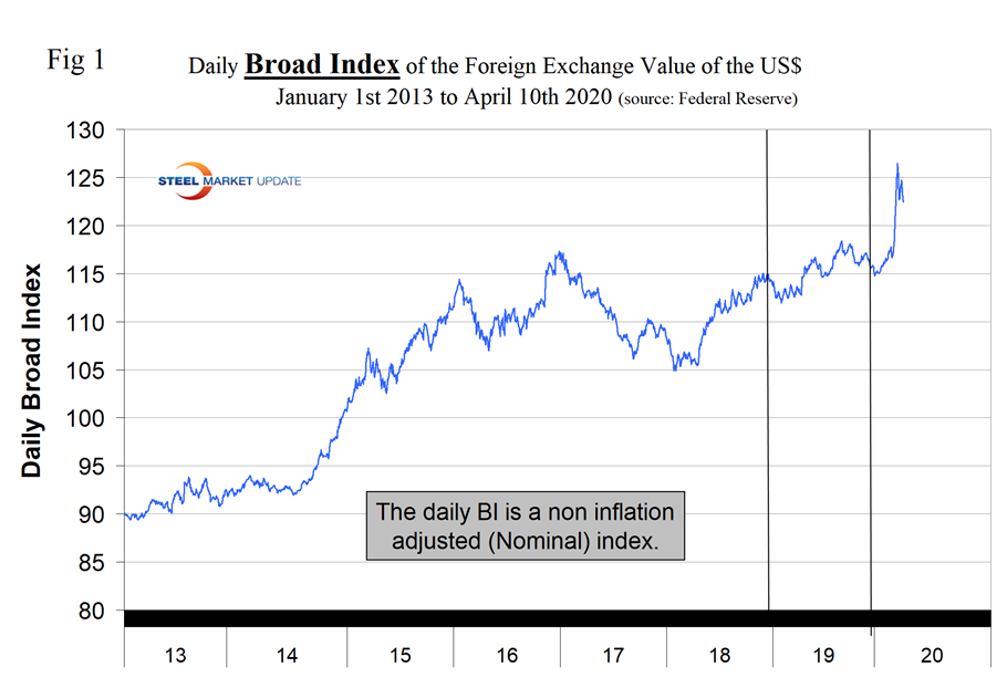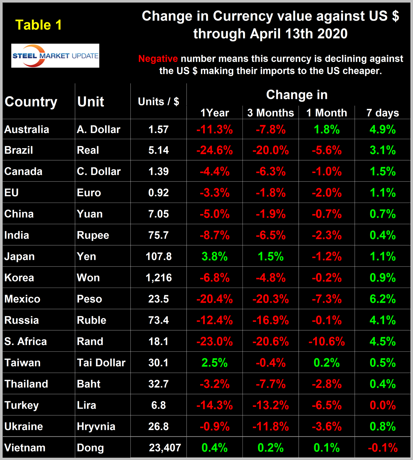 In this report we examine the change in currency values of the 16 preeminent global steel and iron ore trading nations. The currencies of these 16 don’t necessarily follow the Broad Index value of the U.S dollar, but in the last month they did. The latest value of the Broad Index as published by the Federal Reserve was April 10 on which date the dollar was stronger than at any time in the last 18 years. Our country data from Oanda was current as of April 13.