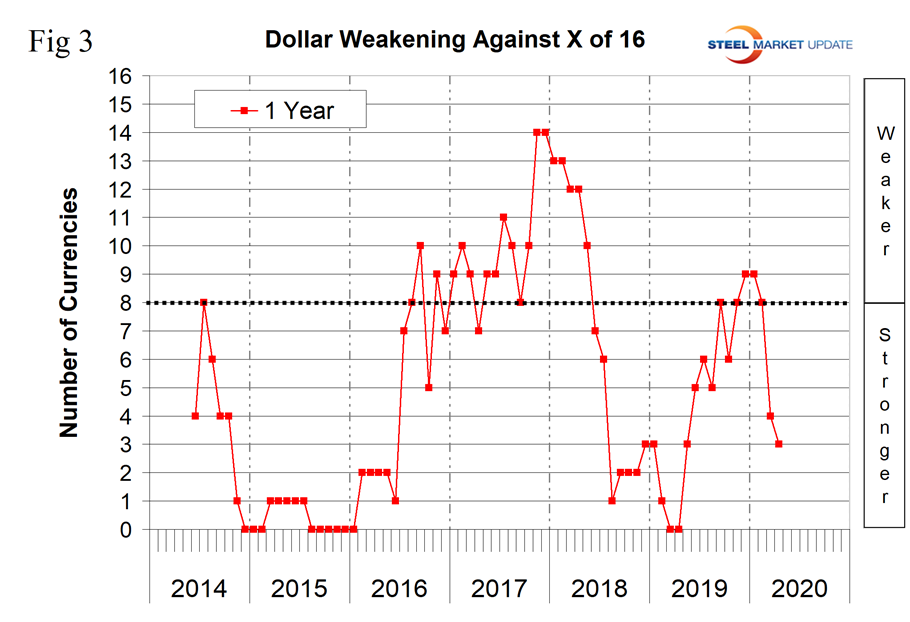 The U.S. dollar strengthened against 14 of the 16 steel and raw materials trading nation currencies in the last three months and also in the last month. There was a turnaround in the last seven days when the dollar weakened against 14 of the 16. In the last three months, the currencies of Brazil, Mexico, Russia, South Africa, Turkey and Ukraine were down by double digits.