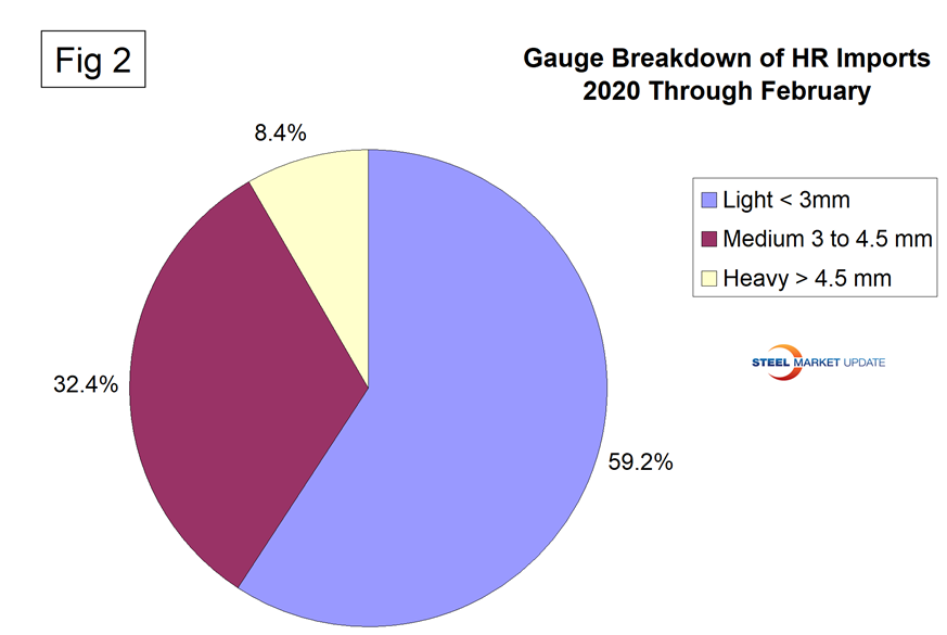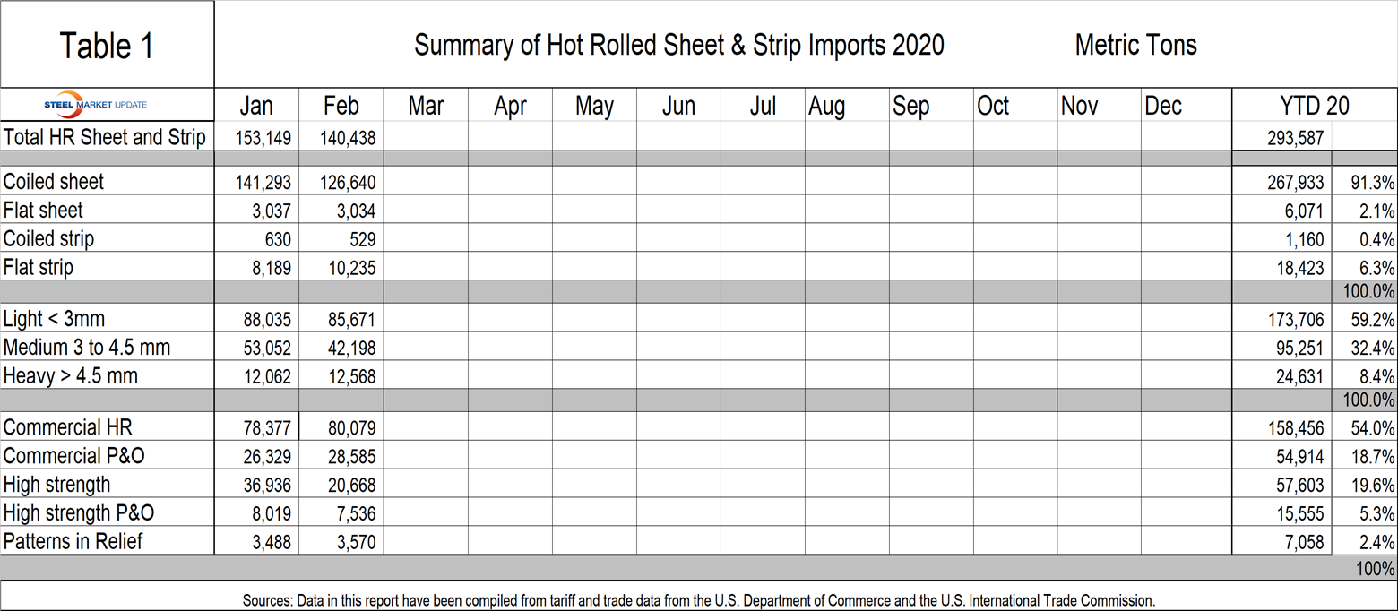 Through February 2020 year to date, of the total hot rolled sheet and strip imports into the U.S., 6.7 percent was strip. Table 1 is a summary for 2020 through February of hot rolled imports showing gauge ranges and condition and the annual year-to-date total for sheet and strip in metric tons.