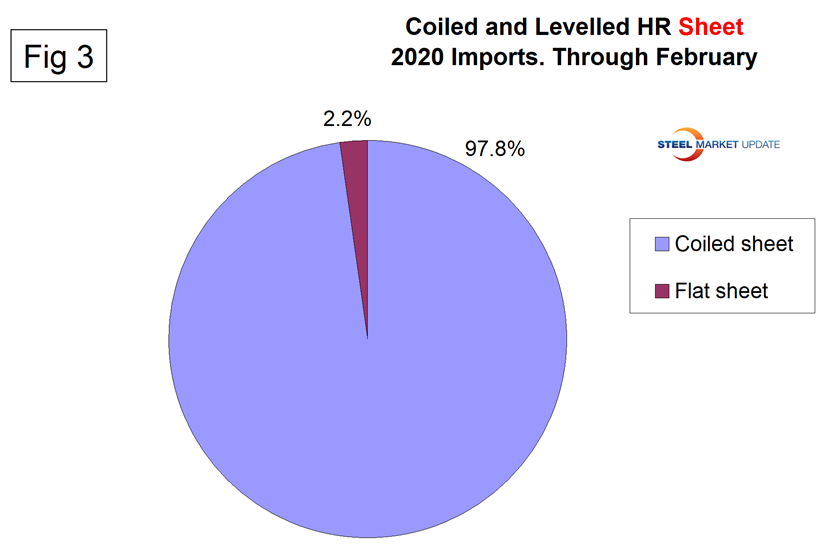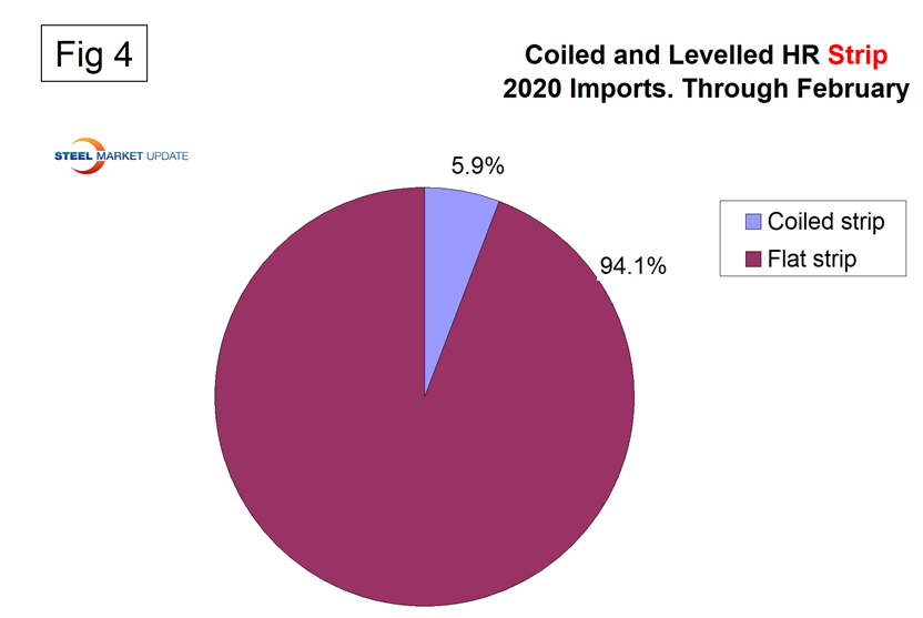 Figures 3 and 4 break the HR sheet and strip tonnages down into coiled and leveled. Through February year to date, 91.3 percent was coiled sheet, 2.1 percent was flat sheet, 0.4 percent was coiled strip and 6.3 percent was flat strip.