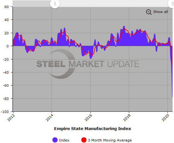 Below is a graph showing the history of the Empire State Manufacturing Index. You will need to view the graph on our website to use its interactive features; you can do so by clicking here. If you need assistance logging in to or navigating the website, please contact us at info@SteelMarketUpdate.com.