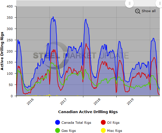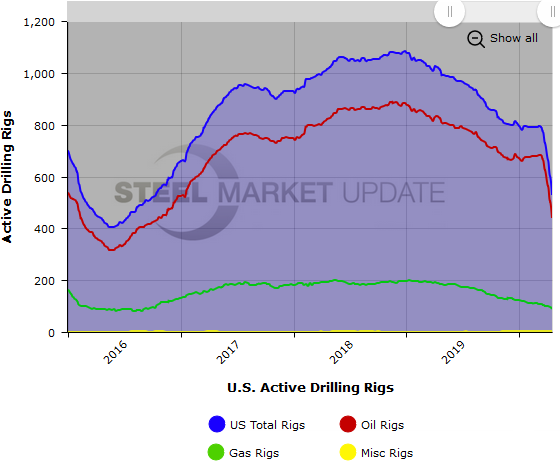 Active U.S. and Canadian drill rigs continued to decline this past week, according to oilfield services company Baker Hughes. The active drill rigs count is important to the steel industry because it is a leading indicator of oil country tubular goods demand.