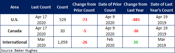 The number of active U.S. rigs fell by 73 to 529, with oil rigs down 66, gas rigs down 7, and miscellaneous rigs unchanged. Compared to this time last year, the 529 count is down 483 rigs, with oil rigs down 387, gas rigs down 98, and miscellaneous rigs up 2. See the first graph below for a history of active U.S. rig counts.