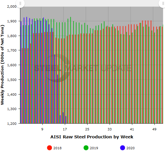 After a brief pause, raw steel production continued to slide last week. Production in the April 25 week totaled 1,250,000 net tons with the mills operating at an average capability utilization rate of 55.8 percent, down 2.1 percent from the previous week, and down 33.9 percent from the same week last year, reported the American Iron and Steel Institute. Capacity utilization among domestic steelmakers has plummeted from more than 82 percent in early March due to the coronavirus crisis.