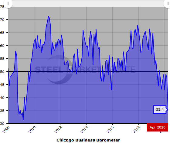 Below is a graph showing the history of the Chicago Business Barometer. You will need to view the graph on our website to use its interactive features; you can do so by clicking here. If you need assistance logging in to or navigating the website, please contact us at info@SteelMarketUpdate.com.