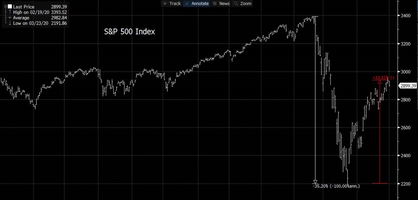 After dropping roughly 35 percent as the virus started really becoming a problem, we’ve regained over half the point drop on the S&P with a vicious rally since late March. What is the market seeing?