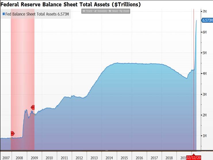 The first chart is daily new cases of the COVID-19 virus here in the U.S. While the date range is hard to see, the market took off when daily new cases started to flatten—maybe even a week beforehand. The second chart is the Fed balance sheet. The Fed is pumping more money, more quickly, into financial markets than they did in the Global Financial Crisis (see the red shaded area). Since late 2019 they’ve expanded the balance sheet by some $2.5 trillion. This served to calm fears that some of the short- and longer-term debt markets may stop functioning. As the saying goes: “Don’t Fight the Fed.”