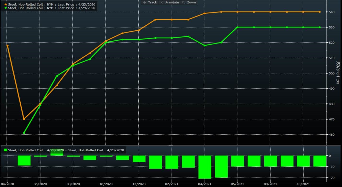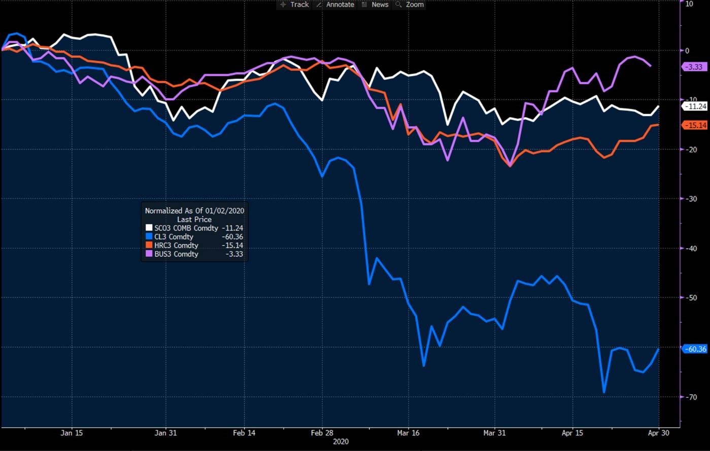 Now on to some of the futures markets. We’ve discussed before the resilience of iron ore in this crisis, but how about scrap? You can see in the below chart the percentage change since Jan. 1, 2020, of oil (blue), HRC (orange), ore (white), and busheling (purple). I’ve used the 3-month forward contract in each commodity for comparison and thus avoided the negative oil price in the spot month. Two observations come to mind. First, the gap between oil and the ferrous complex is enormous. Is this sustainable? Second, what is behind the resiliency in the ferrous complex? I know that may seem like an odd thing to say in a week that saw some of the HRC indices move down dramatically, but that’s why the 3-month contract is helpful as it takes out some of the short term variation. We’d suspect that at least some of the divergence is purely due to the drivers of the different markets. Steel = China. Oil = OPEC.