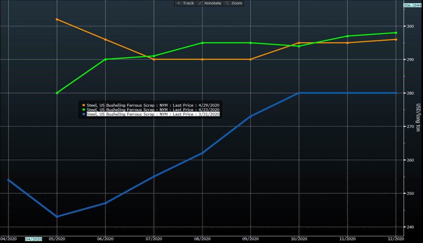 Focusing in a bit on scrap, you can see in the chart below that someone forgot to tell the busheling curve that the world is falling apart. The blue line is from a month ago! It would appear that a big part of the busheling strength is purely supply driven. The automotive shutdowns have had a major negative impact on supply—thus the market has firmed.