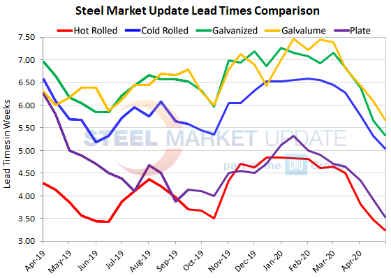 Lead times for spot orders of flat rolled and plate steels declined sharply in April. Lead times ranged from a half-week to a full week shorter at the end of the month than they did at the beginning, depending on the product, according to Steel Market Update’s latest market trends questionnaire.