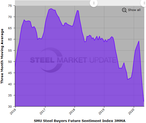 Steel Market Update asked steel buyers how they view their company’s current prospects for success, as well as their chances for success three to six months in the future. The Current Sentiment reading at the end of April was -3, a small improvement from -8 in the beginning of the month, but still in negative territory. Prior to last month, the last time Current Sentiment was in the negative range was November 2010. In early March, prior to the coronavirus shutdowns, Current Sentiment registered +58.