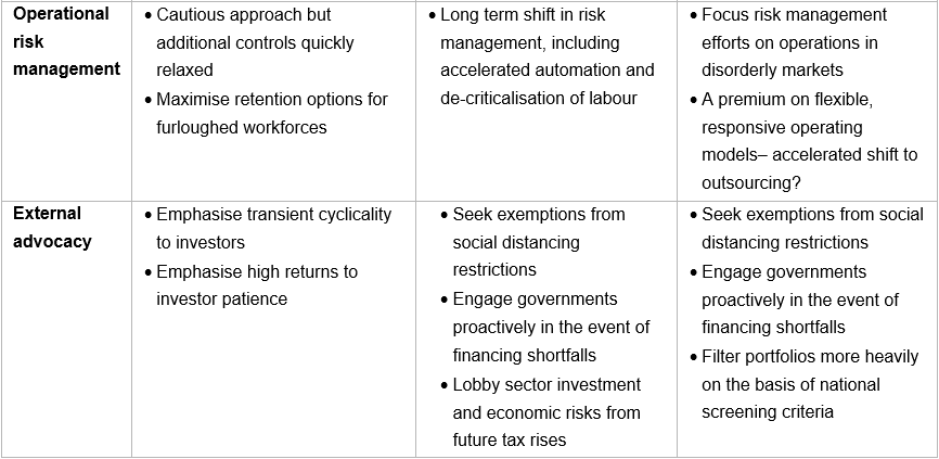 Understanding the potential implications of these scenarios for business decision making is critical. This requires a proper and robust evaluation of the market and firm impacts under different scenarios and actionable strategies. Such exercises are inherently specific to individual resources, industries, market segments, assets and operators. However, a high-level illustration of the potential implications of these scenarios for decisions relating to cash management, capital planning, M&A, operational strategies as well as external relations are shown in Table 1 below.