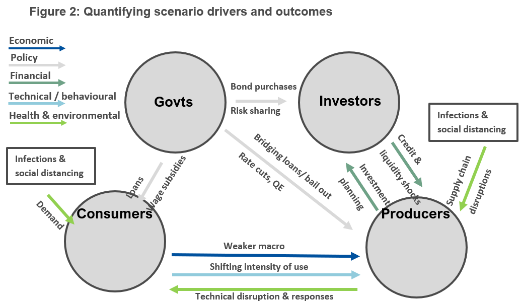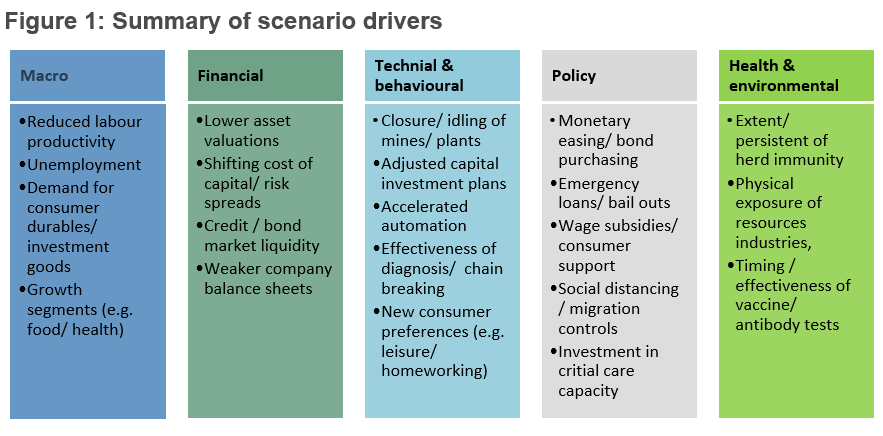 Having agreed to appropriate scenario narratives with the principle internal stakeholders, the next challenge is to identify the relevant drivers. This is an essential step towards a proper and robust evaluation of the market and firm impacts under different scenarios. Here we re-emphasize the importance of challenging traditional—backward looking—thinking on the nature and out turn of these drivers. Previous experience suggests that severe and multi-faceted shocks such as Covid-19 drive fundamental changes in markets which are not uncovered through standard trend-based analysis. This raises a premium on ensuring input to these processes from a range of stakeholders and individuals who are less likely to be encumbered by entrenched positions or traditional thinking.