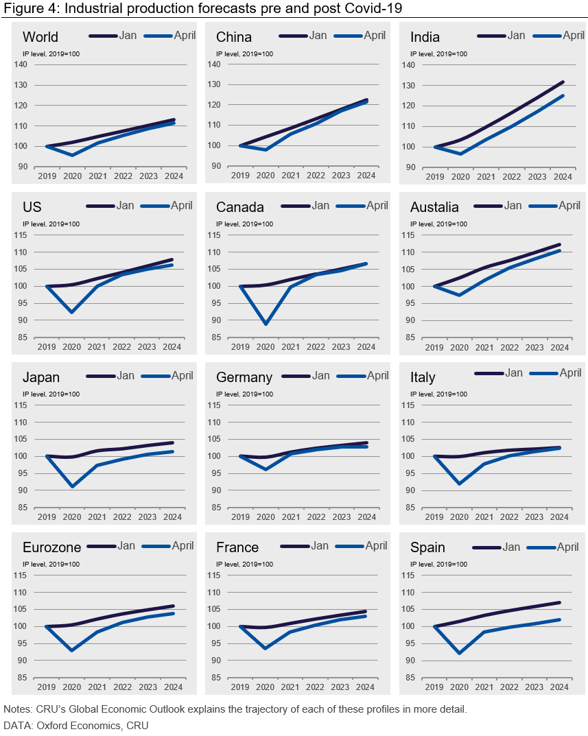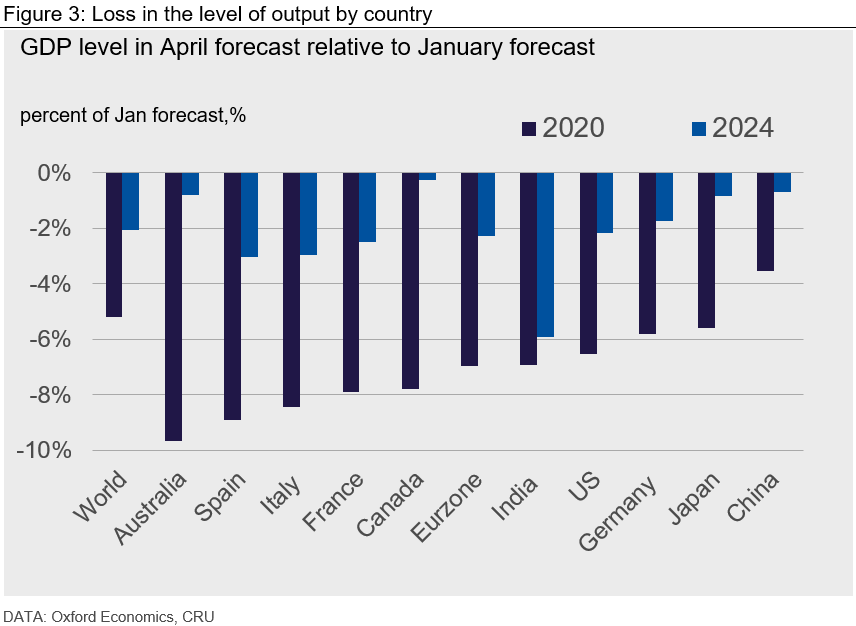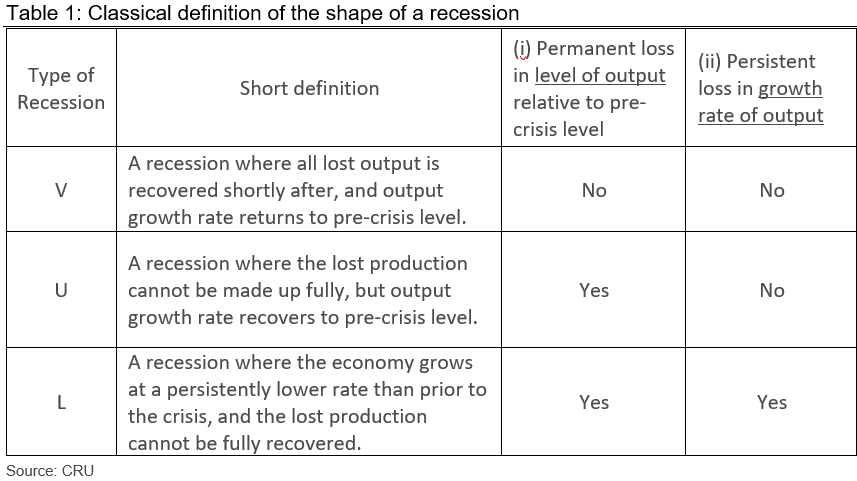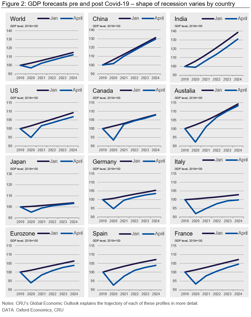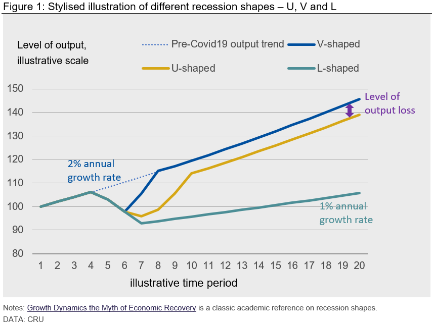 CRU expects the Covid-19 pandemic to give rise to a U-shaped recession for the world economy. That means we expect to see a permanent loss in the level of world GDP, but no impact on long-term world GDP growth rates. Of course, the recession shape can and does vary by country.