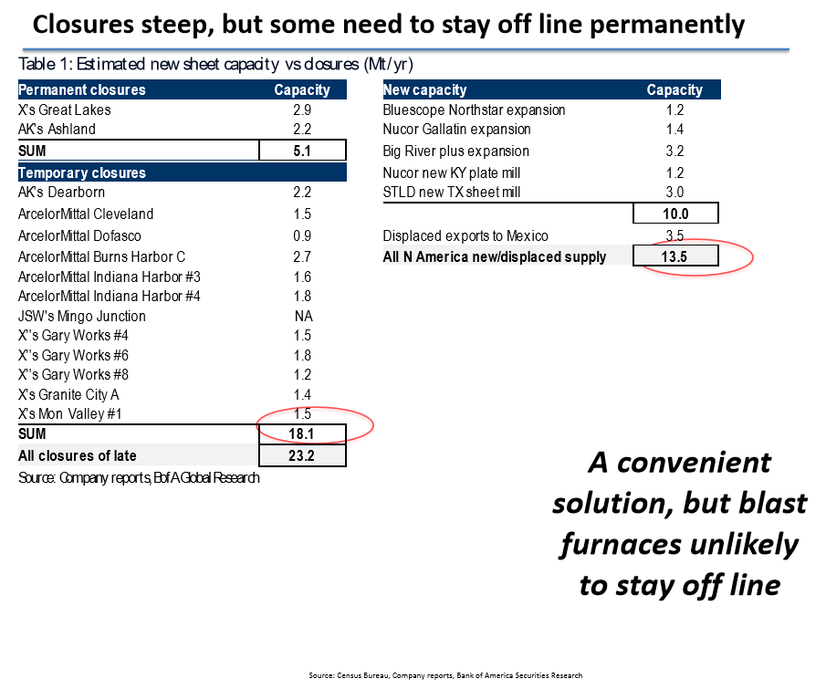 Referring to the chart below on hot melt capacity in the U.S., Tanners noted that U.S. Steel and AK Steel have removed 5.1 million tons of capacity from the market with permanent closures at their Great Lakes and Ashland facilities. Temporary idling of furnaces by U.S. Steel, AK Steel and ArcelorMittal have removed another 18.1 million tons. New capacity planned to come online in the next few years will total 10 million tons—including expansions at North Star Bluescope, Nucor Gallatin, and Big River Steel, plus Nucor’s new plate mill and Steel Dynamics’ new sheet mill. Adding 3.5 million tons of displaced exports that will no longer go to Mexico because of added production south of the border, that totals 13.5 million tons of new steel that will be seeking buyers in the U.S. The net difference between new supply and permanent closures, by Bank of America calculations, is an increase of approximately 8.4 million tons for the U.S. market. Which begs the question: How much, if any, of that 18.1 million tons in temporary closures will be made permanent? “If you ask the mills, they are very adamant that these closures are just temporary. They say the timing of the restarts will be dictated by demand,” Tanners said.