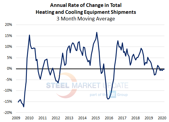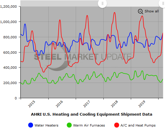 Below is a graph showing the history of total water heater, warm air furnace and air conditioner shipments. You will need to view the graph on our website to use it’s interactive features; you can do so by clicking here. If you need assistance with either logging in or navigating the website, contact info@SteelMarketUpdate.com.