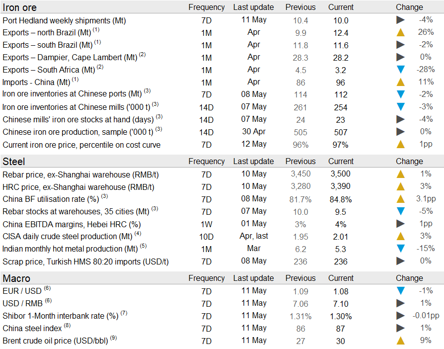 Seaborne supply has disappointed in the past week. Although Port Hedland shipments have been steady at 10 Mt, shipments from Rio Tinto and both parts of Brazil have fallen w/w. In Brazil, there are growing concerns after a sharply rising number of infections and fatalities following the Covid-19 outbreak in the northern parts of the country. Several cities in the state where Vale’s mines are located have gone against the federal government and introduced lockdown measures. The same have been taken in the port city of São Luís where Vale’s Ponta de Madeira port is located. In South Africa, mining restrictions have been lifted but the rail network is still operating at reduced rates, meaning the country will keep exporting at reduced levels for some time.