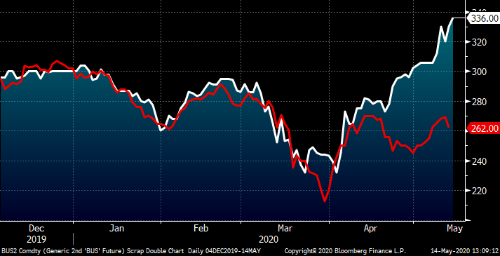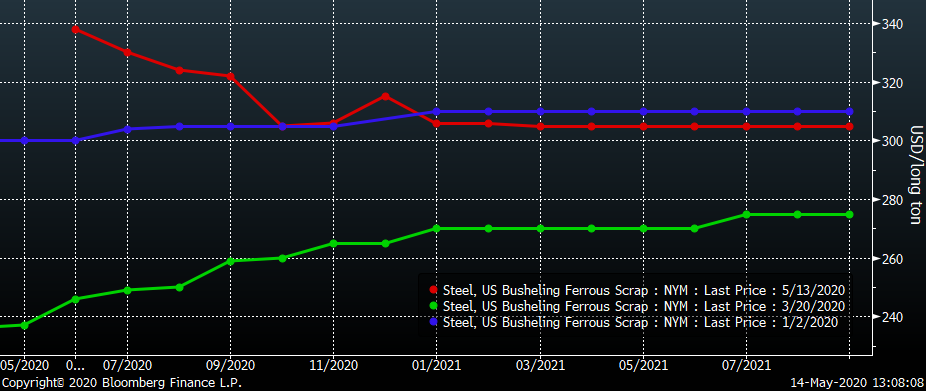 This is a snapshot of the CME busheling futures market today around mid-afternoon with June futures pricing in another +$30 move. The Big Three are set to reopen their factories on Monday, which should help ease the busheling shortage. The knock-on effects of their reopening will keep us all on our toes.
