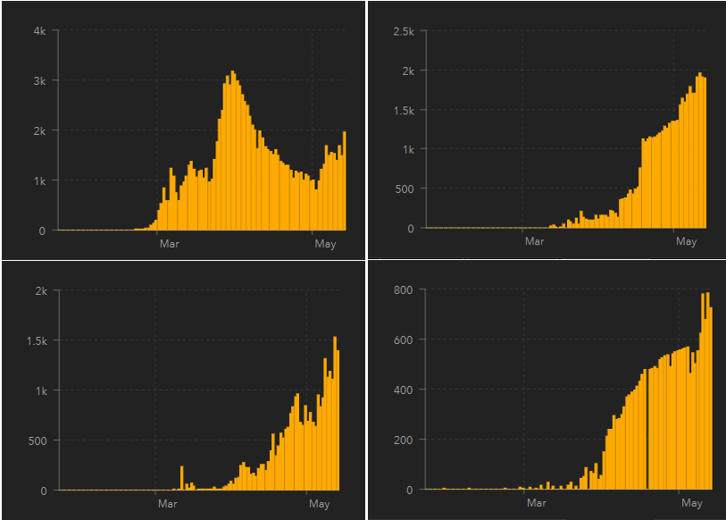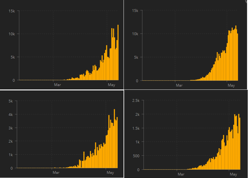 These charts of new daily COVID cases in Iran, Saudi Arabia, Qatar and U.A.E. show exponential growth in infections. Iran is in the upper left corner and you can see after they successfully “flattened” their curve, they have had a resurgence in new cases while Saudi Arabia, Qatar and UAE experience their first wave. I don’t know why this is occurring, but perhaps the reason has to do with Ramadan, which started on April 23. Mass gatherings have been the breeding ground for outbreaks and exponential growth in cases, so perhaps gatherings and travel related to Ramadan are the root cause of their outbreaks. This begs the question, will we see a similar outcome as Iran with the reopening of our economy? If this is our future, what measures will be taken to stop the spread at that point and what will that do to the economy?