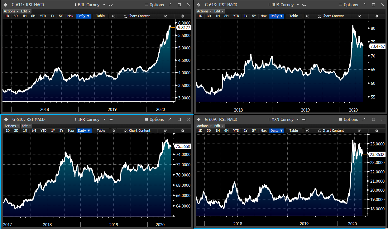Clockwise Brazilian Real (top left), Russian Ruble, Mexican Peso & Indian Rupee