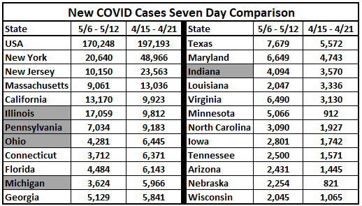 Our nation is polarized on how to manage the COVID pandemic. As states reopen, the idea of a second wave this fall is very concerning, however considering where we are at with current daily infections, there is a very real risk that this initial wave keeps going and the virus resumes its exponential growth. In my last SMU article, I provided a table of new COVID cases over the one-week period from 4/15 to 4/21 (states with Midwest flat rolled mills highlighted in grey). This table compares those cases with the cumulative number of new COVID cases over the one-week period from 5/6 to 5/12. Some states have improved while others have seen their cases worsen. Regardless, there is still an enormous number of new cases across the country.