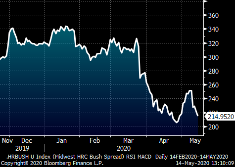 Or the sharp drop in the spread between Midwest HRC and busheling. Who will be the one to profit from buying the LME Turkish scrap futures and selling the CME busheling futures? What will EAFs do to recover their profit margin? Will they raise flat rolled prices? Will they look to alternatives to busheling such as DRI, pig iron, etc.? An article earlier this week noted an anonymous Indiana recycler talking about $400 busheling in June. Likely talking up their book, I wonder if busheling can sell at $400? It last traded that high in 2018 when HR was above $800. In the current environment, how many service centers would dump their aged HR inventory at $400 to raise cash? With the last of the barges heading south in early June as the Illinois river closes, will busheling stuck in the Midwest accumulate forcing the price lower as the market shifts from shortage to oversupply? That’s a lot for busheling to overcome in the weeks ahead, but this rally horse has been the clear-cut champ of 2020 and might have a race or two left before heading to the glue factory.