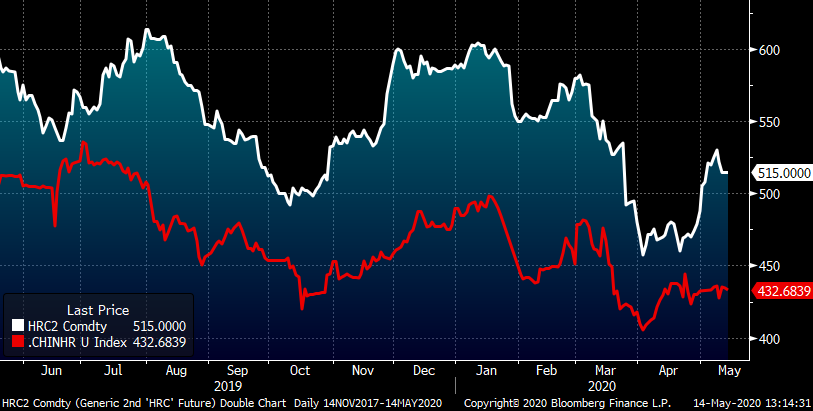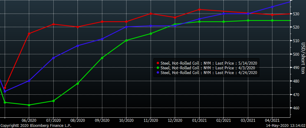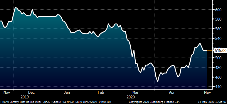 After collapsing from $560 on March 1 to a low of $445 on April 3, the June HRC future remained range bound between $460 to $480. Then on April 30, the June future broke out of its range in response to ArcelorMittal’s price increase announcement. June traded as high as $534 last Friday as rumors circulated of a second price increase announcement. At $534, buyers are not only factoring in this second price increase occurring, but also that the mills will successfully capture the full amount of both increases. As stated above, the return of the Big Three brings with it the anticipation of the domestic mills supply-side response to the reopening of automotive manufacturing. With so much abrupt action taken in the wake of the outbreak, expect the unexpected and more unintended consequences to keep coming.