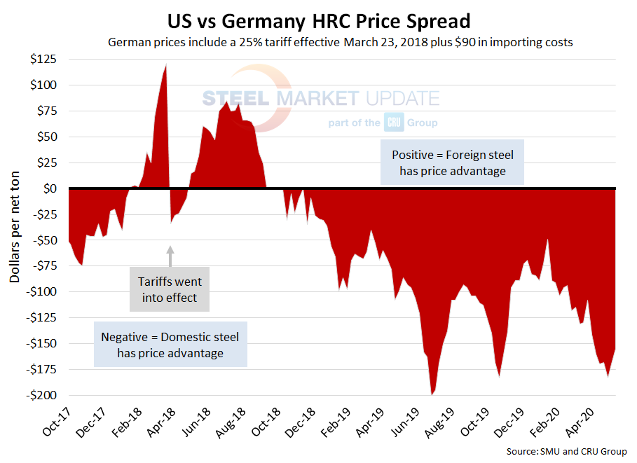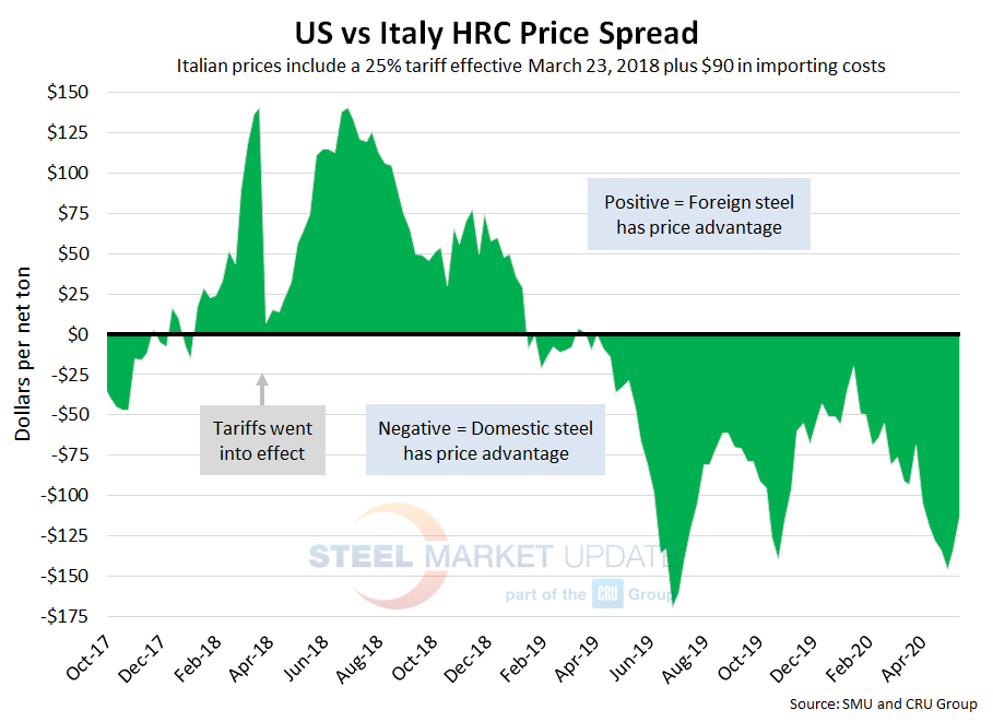 CRU published Italian HRC prices at $394 per net ton, down $17 from last week and down $19 over two weeks ago. After adding tariffs and import costs, the delivered price of Italian HRC is approximately $583 per ton. Accordingly, domestic HRC is theoretically $113 per ton cheaper than imported Italian HRC; the spread was $134 the previous week and $146 two weeks prior. U.S. prices have held this price advantage for over one year.