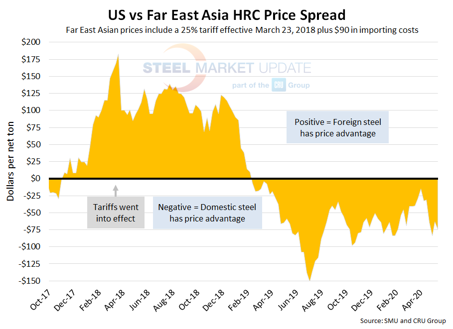 The CRU Far East Asian HRC price rose $9 per ton over last week at $363 per net ton, unchanged over two weeks ago. Adding tariffs and import costs, the delivered price of Far East Asian HRC to the U.S. is $544 per ton. Therefore, U.S.-produced HRC is theoretically $74 per ton cheaper than imported Far East Asian HRC; the spread was $63 last week and $84 two weeks ago. Domestic prices have held this price advantage for 15 consecutive months.
