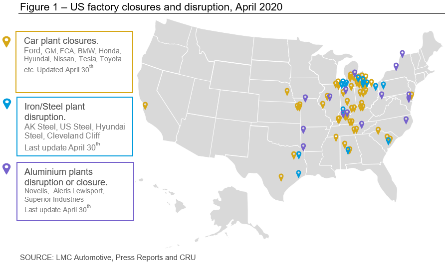 Many sectors are suffering, including the metal-intensive sectors. To give only a few examples, Ford, GM and Fiat-Chrysler closed plants in March affecting hundreds of thousands of employees. Construction sites were also affected; for instance, U.S. Steel announced in April a delay to the $1 billion project at the Mon Valley Works, putting at risk the 3,000 employees of the complex. Overall, motor vehicle and parts manufacturing employs more than 1 million people in the United States. However, some automakers (including Fiat-Chrysler, Ford, GM and Toyota) are planning to re-open most of their plants in mid-May.