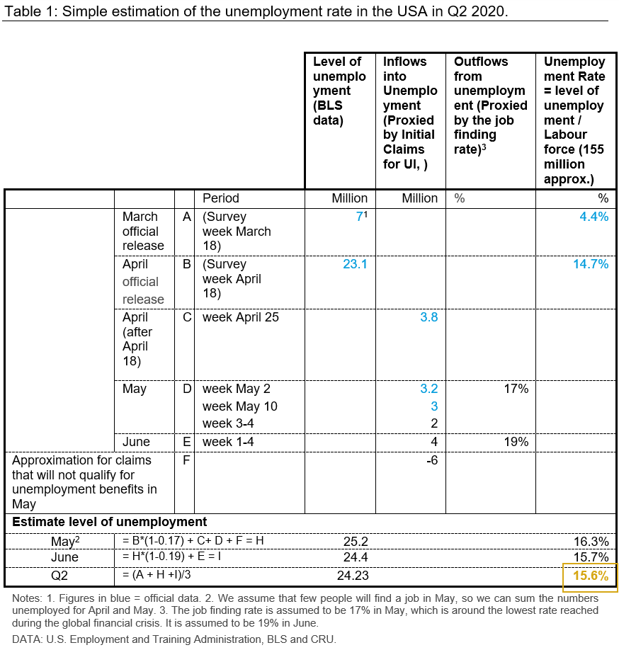 This estimation gives us an unemployment rate of 16 percent in Q2 2020.