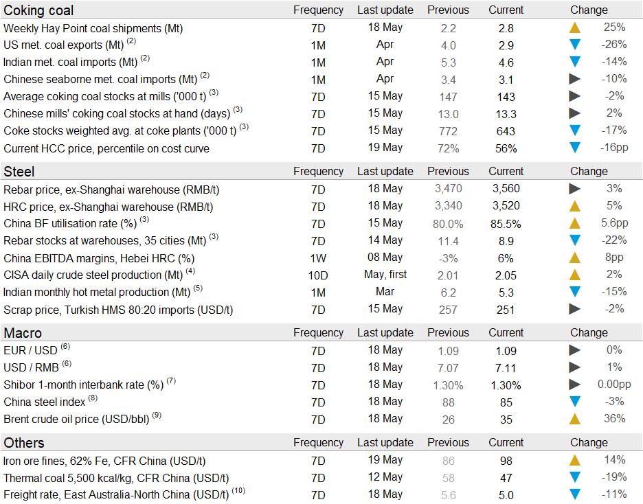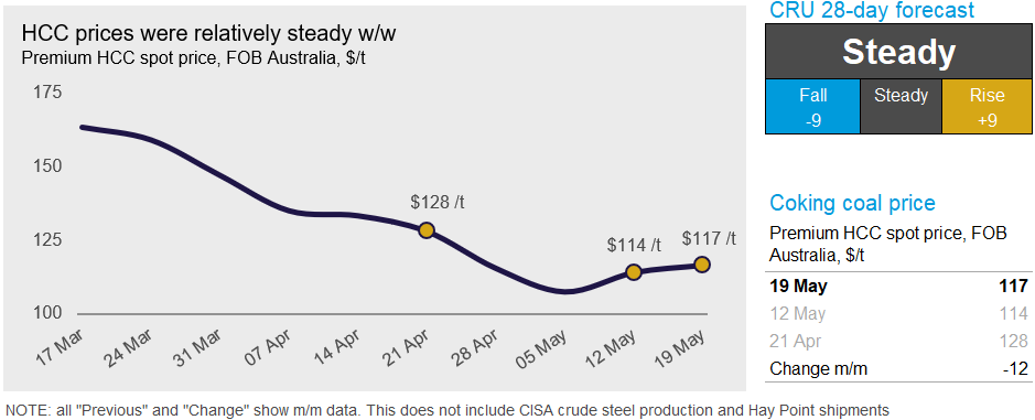On May 19, CRU assessed the Premium HCC $2.5 /t higher w/w at $116.5 /t, FOB Australia. We expect coking coal prices to consolidate around current levels for another couple of weeks.