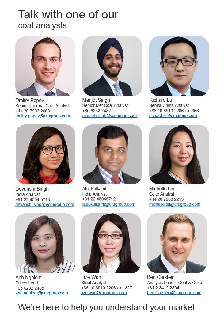 In China, the current sentiment in the steel industry is quite positive. The steel inventory destocking accelerated last week and BF capacity utilization remains high. Also, steel mills exhibited higher demand for coke on the spot market, causing a slight uptick in Chinese coke prices. According to our sources, the capacity utilization of the merchant coke producers is currently more than 80 percent, the highest levels since August last year. However, coal stocks at mines remain quite high and thus the upward pressure did not get translated into domestic coal prices. Separately, there were a few unconfirmed reports suggesting some utilities and steel producers in China have received verbal notices that import restrictions, especially on Australian coal, could increase in the coming weeks.