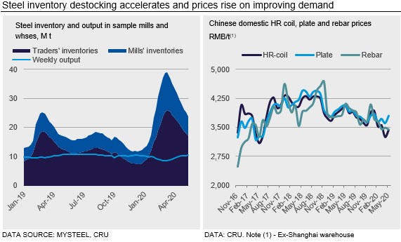 Steel demand recovery has been visibly strong in China, but there are concerns about its sustainability. The massive increases of auto sales in April are a result of short-term subsidies and also associated with the fact that people feel safer in private cars than on public transportation. Meanwhile, hot weather and the rainy season will disrupt construction activities in southern China. These will limit further growth of underlying steel demand. CRU believes that steel destocking will continue, but at a slower pace than in April.
