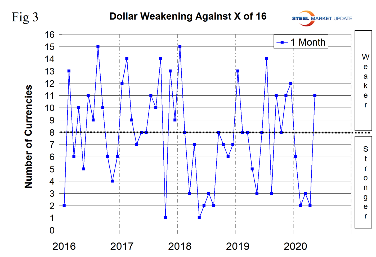 The story of the currencies of the steel and raw materials trading nations was dramatic in the 30 days through May 18, which is likely to be a precursor of the next few months. Steel Market Update tracks the currencies of these 16 nations on a daily basis and reports monthly. Table 1 shows the number of currency units that it takes to buy one U.S. dollar and the percentage change in the last year, three months, one month and seven days. The overall picture for the steel trading nations is that in the last year and in the last three months the picture hasn’t changed much from our April 13 report, but in the last 30 days the dollar weakened against 11 of the 16 currencies. In our April report, the dollar strengthened against 14 of the 16 at the one month level—a huge turnaround. Table 1 is color coded to indicate weakening of the dollar in green and strengthening in red. We regard strengthening of the U.S. dollar as negative and weakening as positive because of the effect on net imports. Figures 2 and 3 show the extreme gyrations that have occurred at the three-month and one-month levels in the last four years.