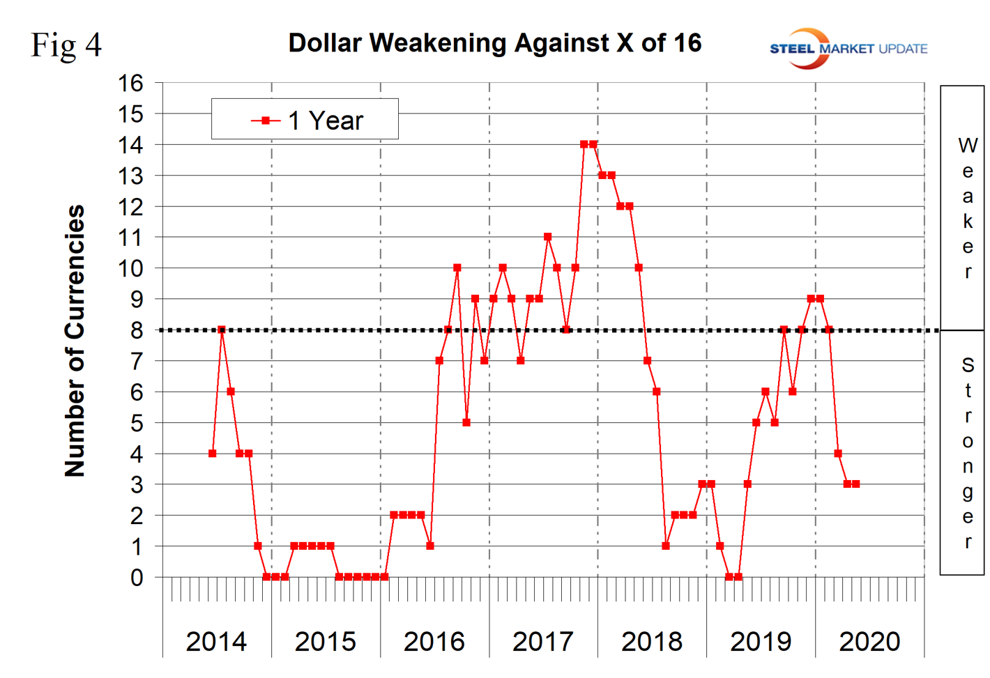 The U.S. dollar weakened against 11 of the 16 steel trading nation currencies in the last 30 days, through May 18. The biggest change was that the Brazilian real headed in the other direction and declined by 9.2 percent. The effect of the coronavirus pandemic was not evident at the three-month level when the dollar strengthened against 12 of the 16. In the last three months, the currencies of Brazil, Mexico, Russia, South Africa and Turkey were down by double digits.